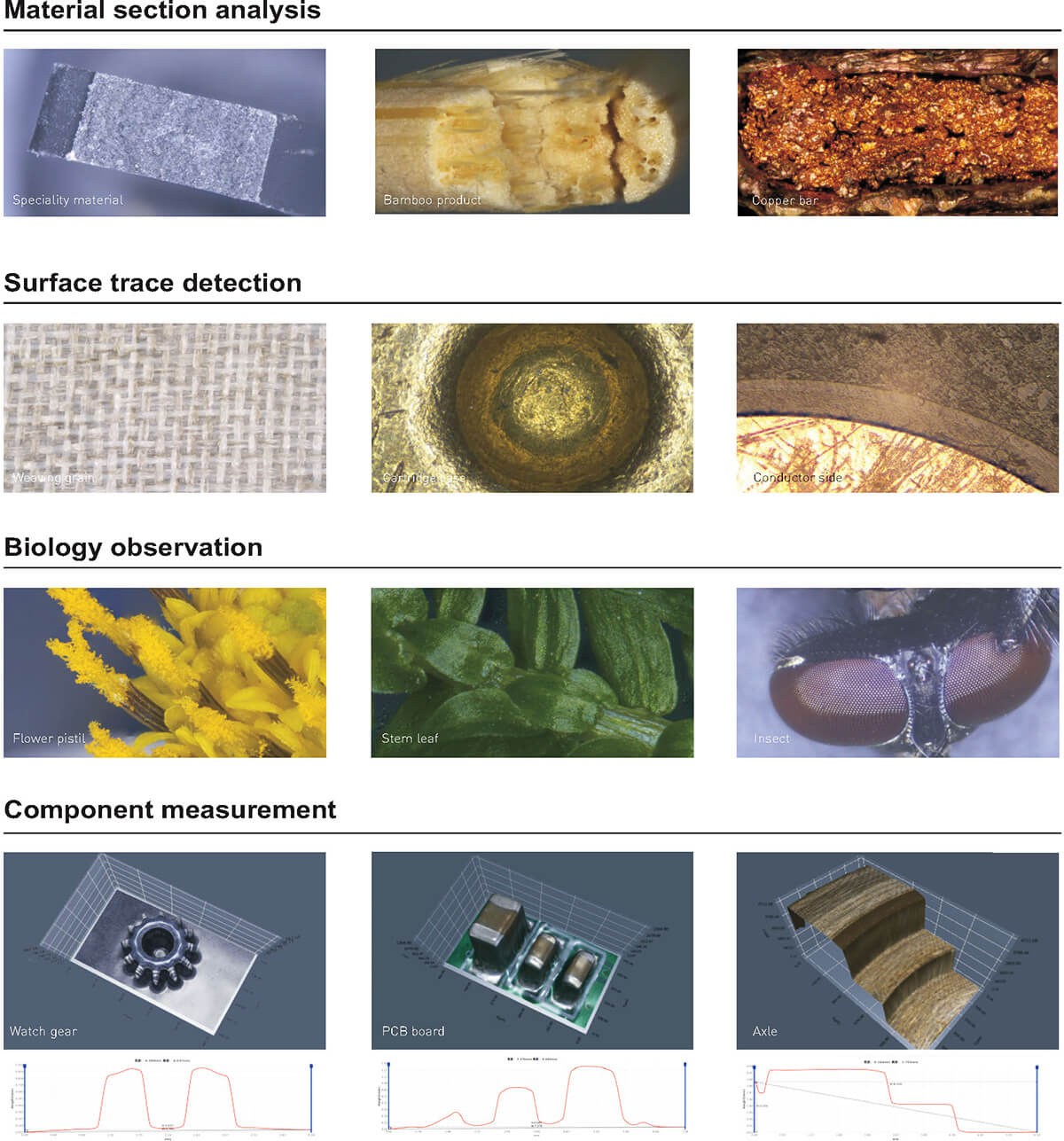 - 材料斷面分析、表面痕跡檢測、生物學觀察、零部件測量。