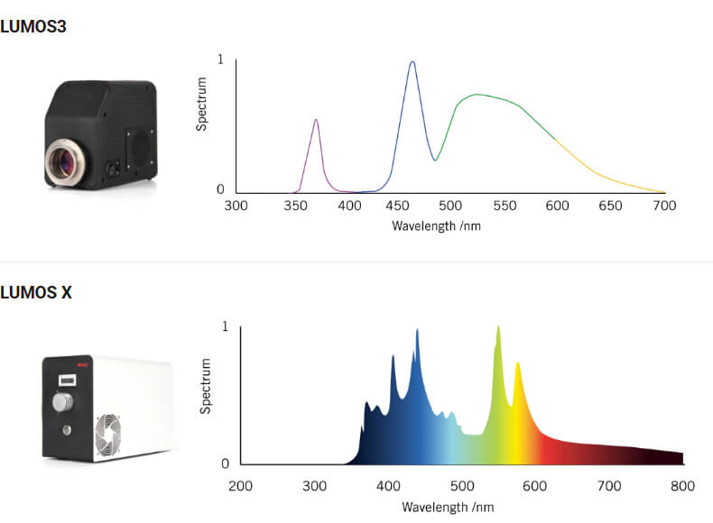 - LUMOS3:LED 光源,平均壽命長達 20,000 小時,低光毒性。三通道 LED 螢光,每個通道獨立控制,切換濾光片時可自動調整。