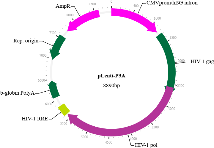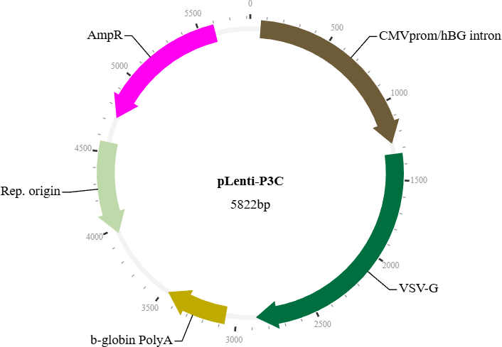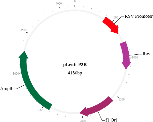 - 由包裝質體1「pLenti-P3A」(表現 Gag、Pol)、包裝質體2「pLenti-P3B」(表現 Rev)和外套膜質體「pLenti-P3C」(表現 VSV-G)三種質體混合而成的即用型慢病毒包裝 DNA 混合物。